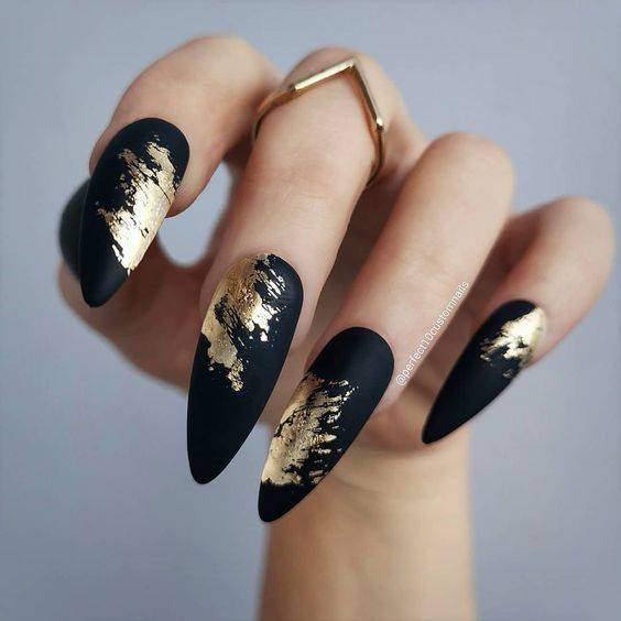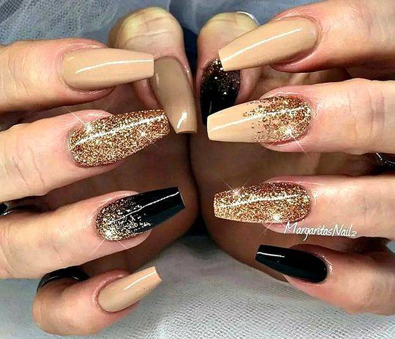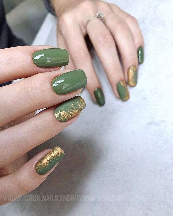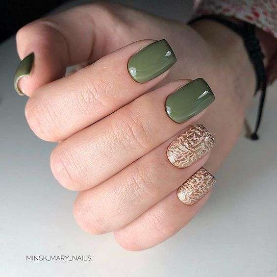 По-настоящему празднично будет смотреться золотистый маникюр. Он придаст эстетики даже самому простому образу. Этот цвет лучше всего смотрится в тандеме с зеленым, коричневым, черным и красным нарядом. Здесь можно выбирать любой тип покрытия: