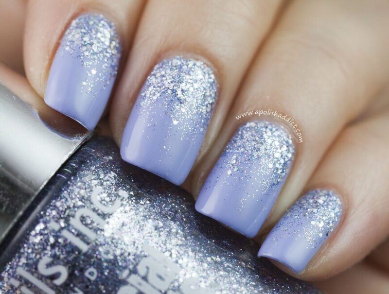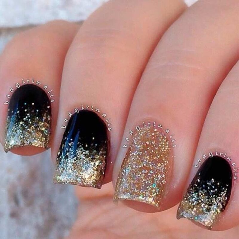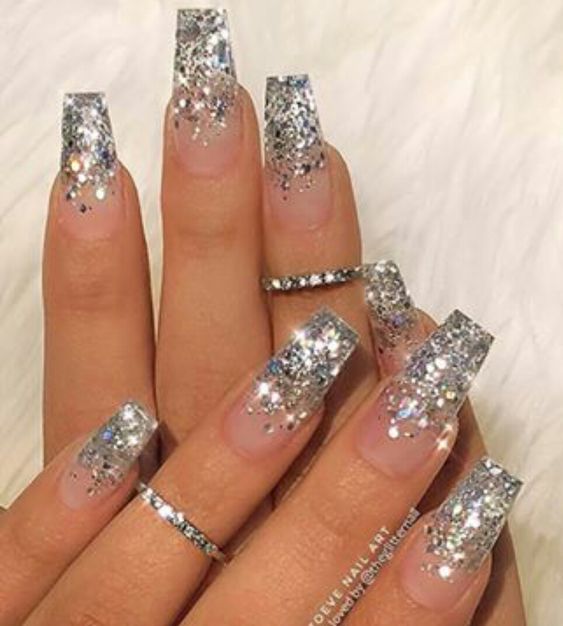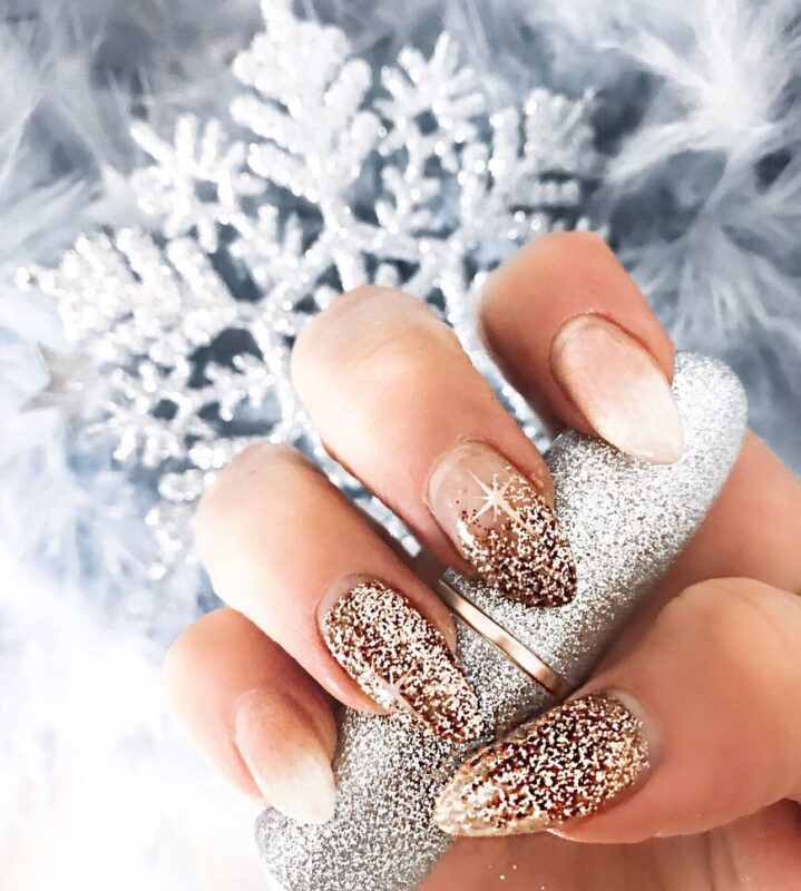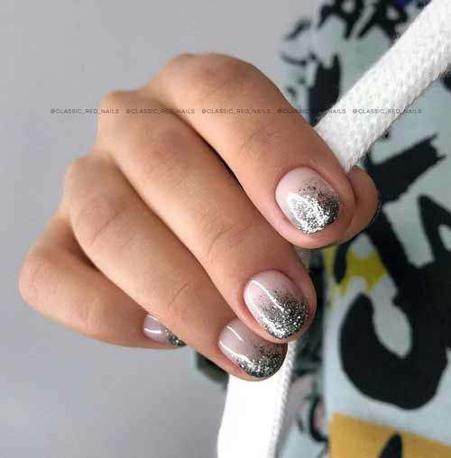 Если хочется красивых переходов на ноготках, то смело делайте градиент. Кроме того, в этом праздничном сезоне очень модно поверх цветного градиента, дополнительно делать легкую растяжку серебряными блестками. Это выглядит очень стильно и нарядно.
