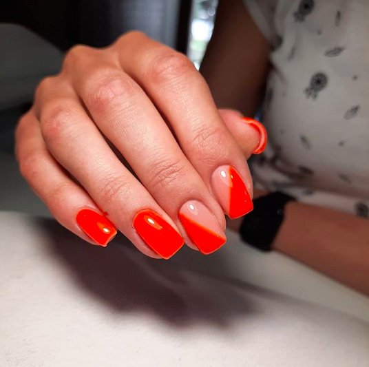 Если не хотите желтый маникюр, но все равно есть желание быть яркой, попробуйте выбрать оранжевый цвет. Но будьте осторожны: он подойдет не для каждого образа. Нужно будет выбрать подходящее платье и сделать впечатляющий макияж. В качестве рисунков можно выбрать горошек, мандарины или геометрию.