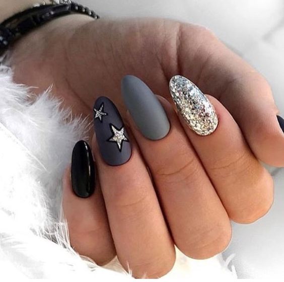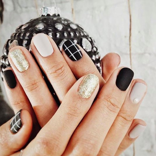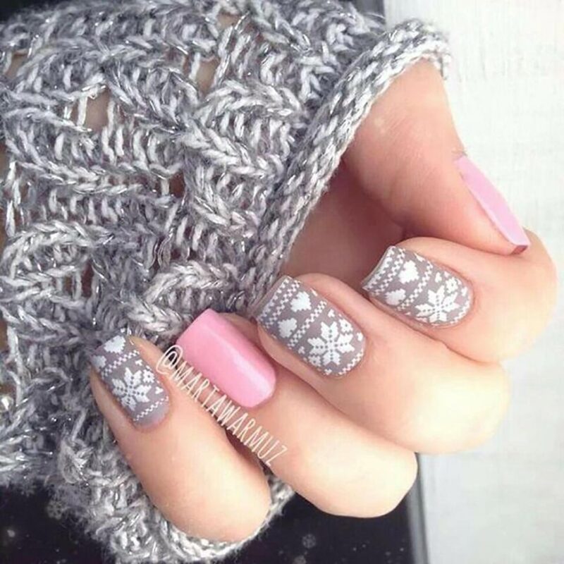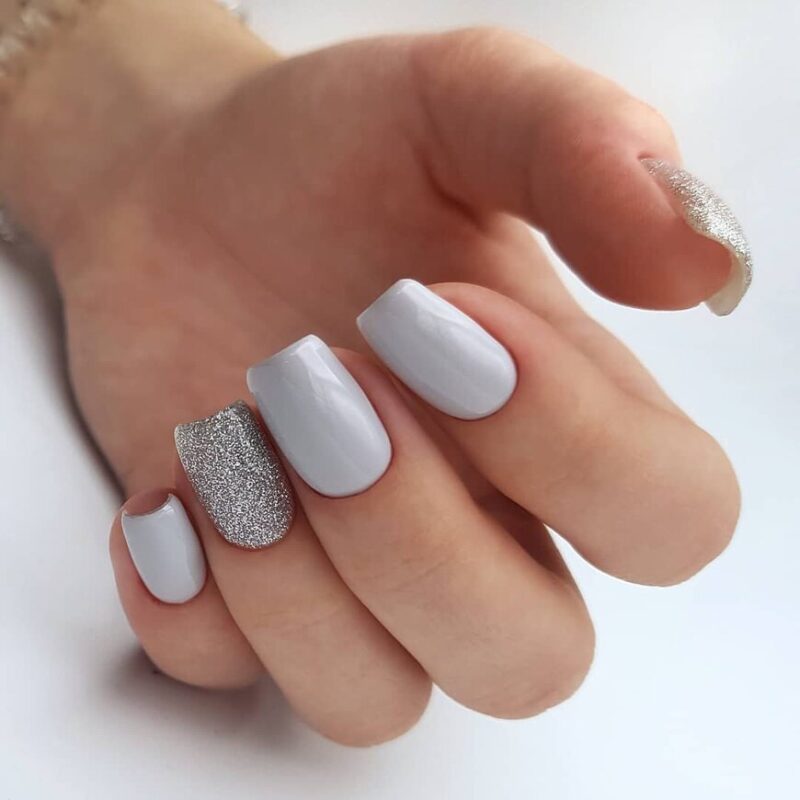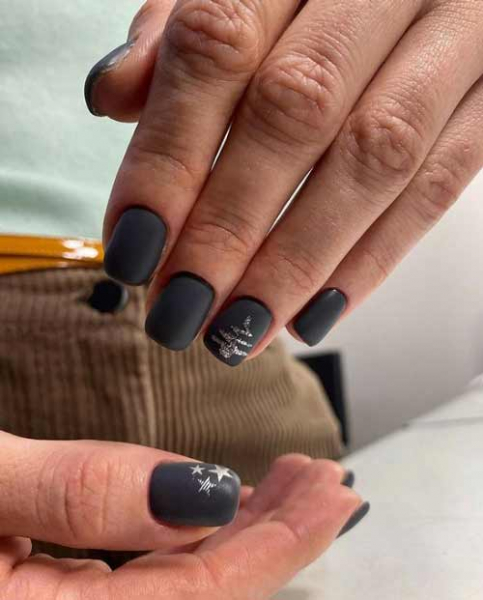 Некоторые люди считают, что серый безликий цвет и совершенно не подходит для новогоднего маникюра. На самом деле серый в сочетании с белым и серебристым позволяет создать сияющий и универсальный французский маникюр на Новый год. К тому же оттенки серого отлично сочетаются и с другими модными цветами лака.