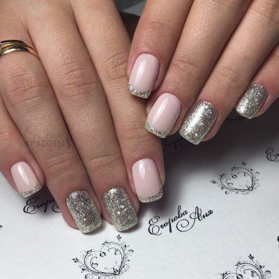 Не все девушки выбирают на Новый год очень яркий дизайн ногтей. Для наряда в светлых тонах подойдет нюдовый французский маникюр. Он может быть декорирован небольшим количеством блесток и страз, а улыбка может быть выполнена жидким металлом. К тому же сразу же после Нового года многим девушкам нужно выходить на работу, а слишком яркие цвета маникюра могут быть запрещены дресс-кодом компании. Поэтому нюдовый французский маникюр в таком случае станет отличным решением.