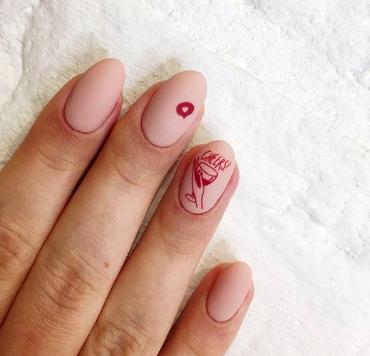 Бежевые ногти будут выглядеть эффектно в сочетании с красным глянцевым лаком. Наклейки на ногти станут отличным дополнением к милому нейл-дизайну.
