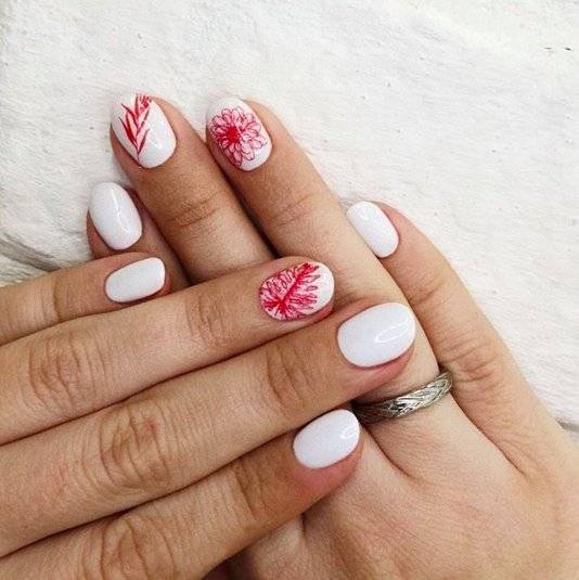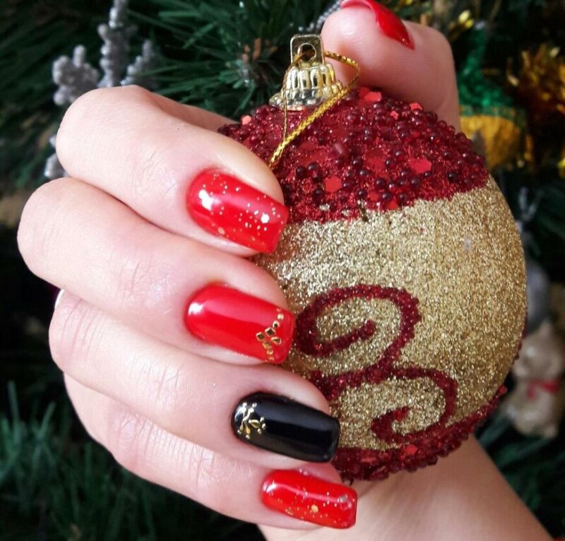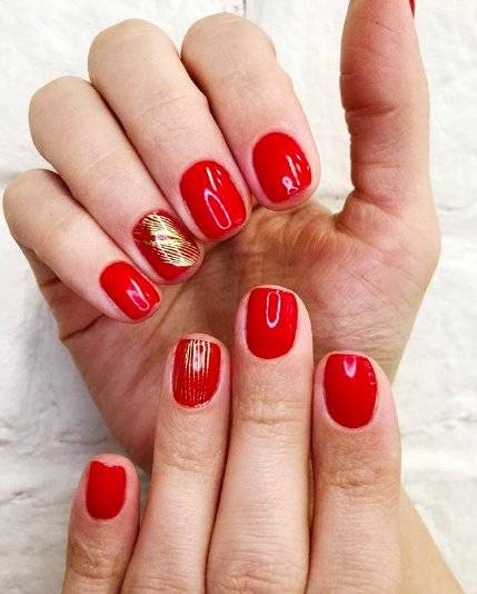 Актуален будет любимый многими женщинами красный цвет. Он потрясающе смотрится в однотонном варианте, но в тандеме с декором поражает своей красотой. Его лучше всего сочетать с серебром, золотом, фольгой или блестками. Необычным вариантом станет красный френч. Попробуйте отойти от классики и поменять оформление лунки.