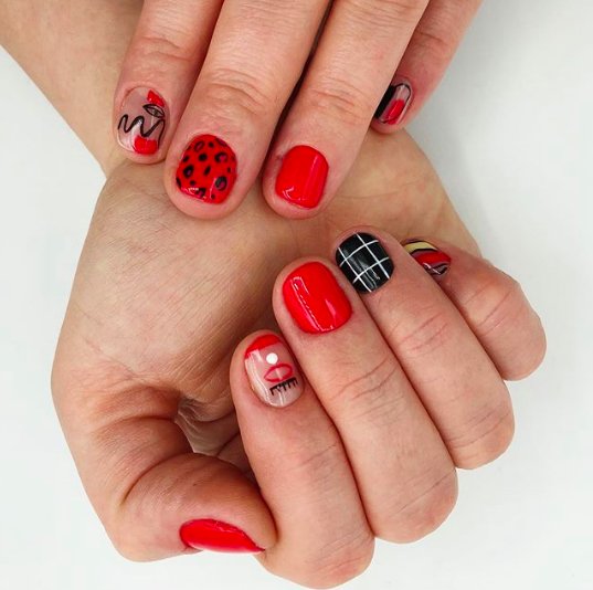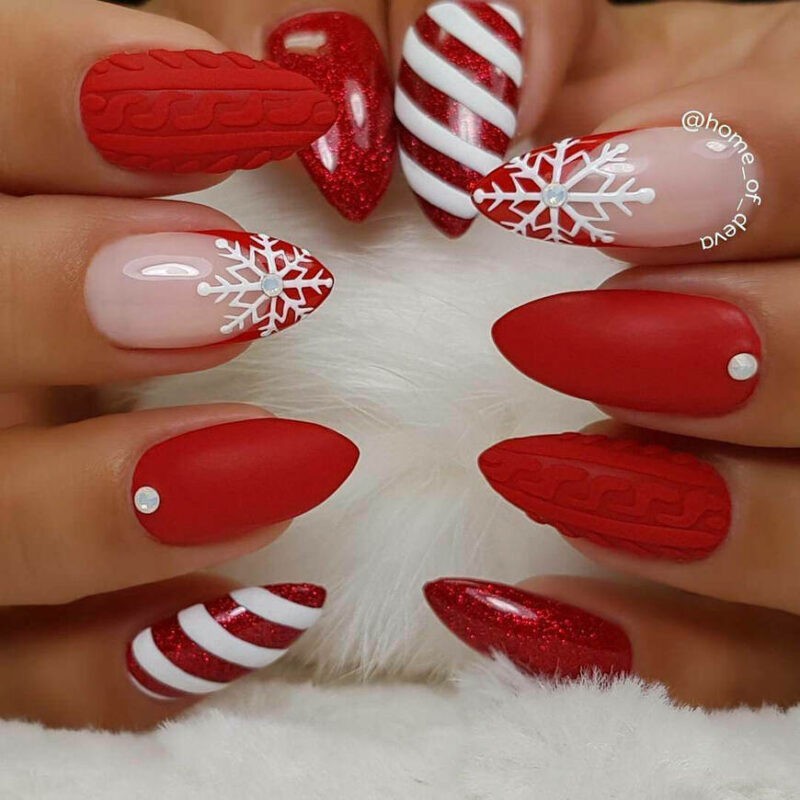 Новогодний дизайн для коротких ногтей отличается разнообразием и продуманностью. Яркие полоски красного цвета и тематические рисунки дополняют нейл-дизайн.