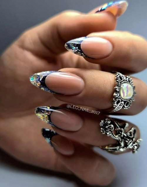 В этом Новогоднем сезоне французский маникюр тоже должен сиять и блестеть. Поэтому, френч нужно украшать фольгой, блестками и стразами.