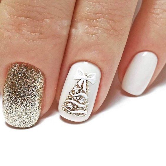 Белый цвет никогда не выходит из моды и прекрасно сочетается в маникюре с различными рисунками и другими цветами. Помимо этого — это один из главных цветов Нового 2021 года, поэтому белоснежные ноготки с праздничным принтом, узорами и сверкающим декором – беспроигрышный и универсальный вариант. Для создания маникюра в соответствующей тематике достаточно просто нанести на ноготки белый лак и выделить блестящими рисунками, например, снежинками или ёлочными шарами, пару ноготков. Если это предложение кажется вам слишком простым, то можно украсить один из пальчиков объёмной композицией из бусин или страз в виде шара или бантика, а на соседней пластине использовать для покрытия мелкие блёстки.