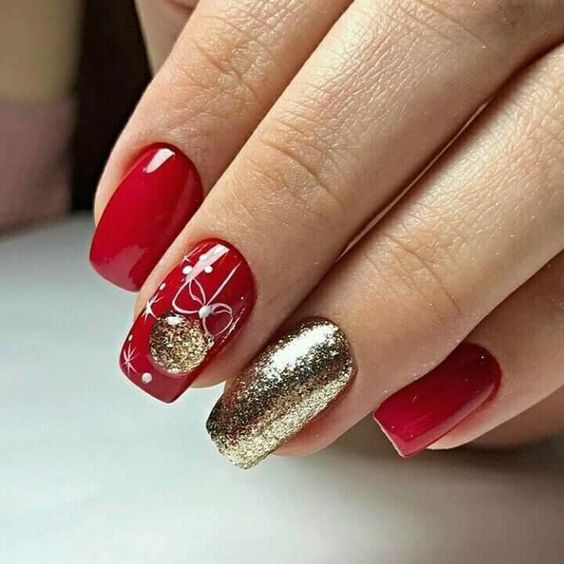 Сочетание красного, зеленого и белого цвета на коротких ногтях отлично дополняет новогоднюю цветовую гамму любого наряда. Золотистые вкрапления в верхней части ногтевой пластины добавляют сияния.