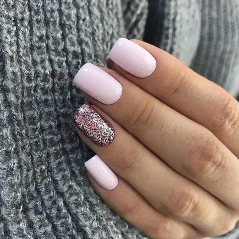 А чтобы ногти были более интересные, можно добавить бархатную пудру или глиттер на пару ногтей.