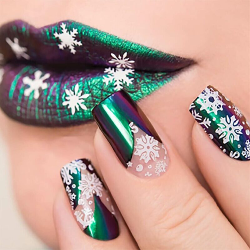С помощью стемпинга можно легко нанести зимний рисунок – снежинки, снеговика, ёлочку, пингвина, новогодние шарики и ещё много всего, что ассоциируется у нас с новогодними праздниками и Рождеством, морозом, снегом и весельем.