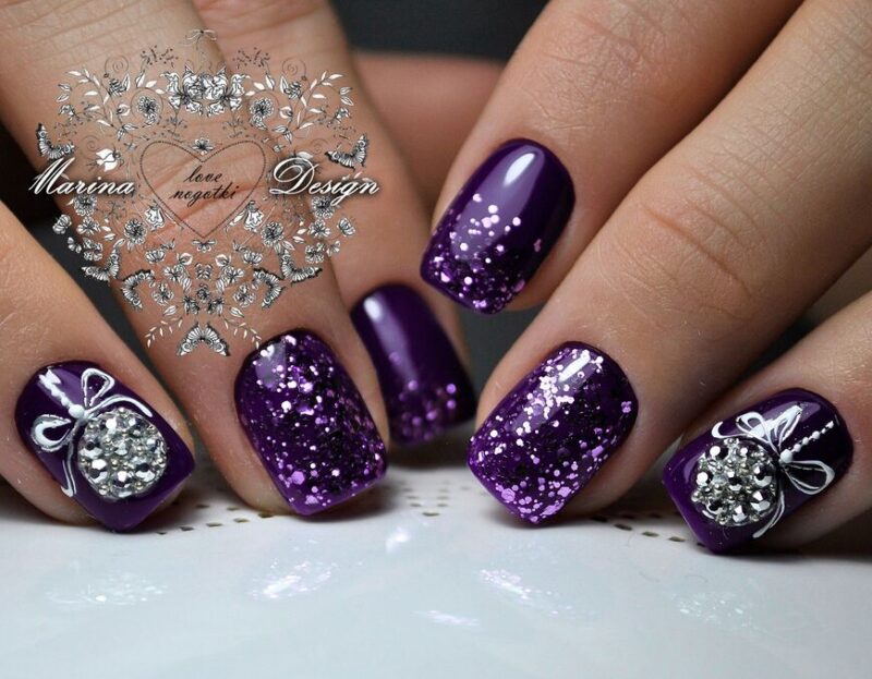Точно также создаем декор на безымянном пальце, только градиентная полоса с блестками будет посредине, а стразы и бульонки-по бокам.