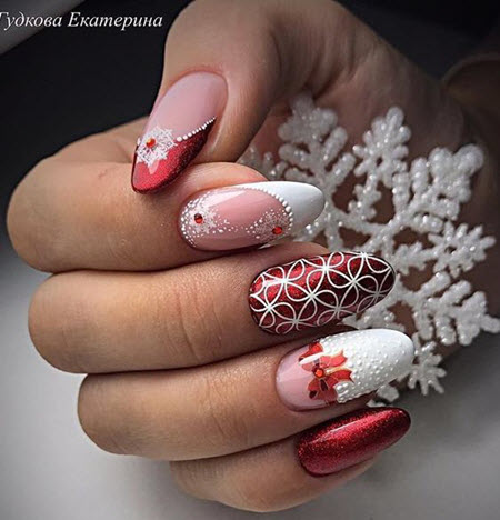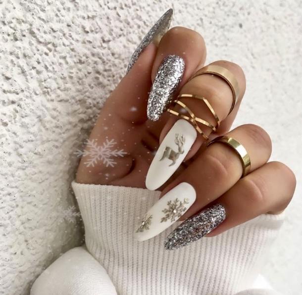 Популярны половинки снежинок и узор или один рисунок на два ногтя. Красиво смотрятся серебряные елочки, снежинки, еловые лапки и другие новогодние рисунки. Серебро или золото в маникюре рекомендуется выбирать в зависимости от украшения. Серебро выбрано для серебра, золото выбрано для золота. Если используется несколько смешанных украшений, возможны все варианты. Главное, чтобы маникюр выглядел утонченно, естественно.