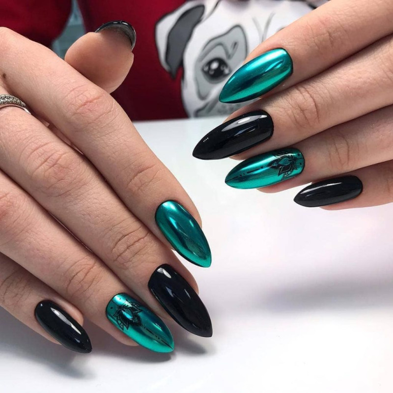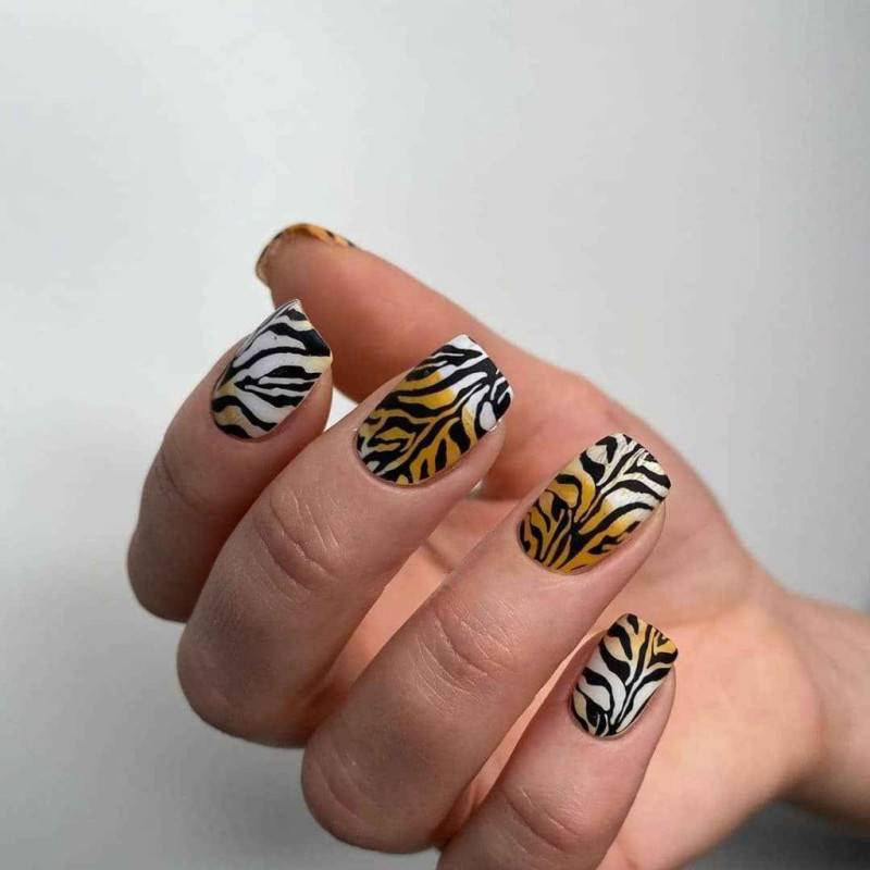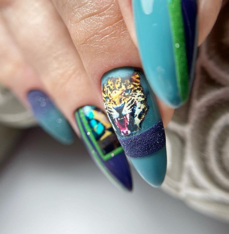 Дизайнеры нейл-индустрии рекомендуют сделать маникюр с оттенками, которые ассоциируются с этим благородным хищником: красным, оранжевым, металлическими, черным, зеленым, синим, которые подойдут не только на длинную форму ногтей, но и на короткую.