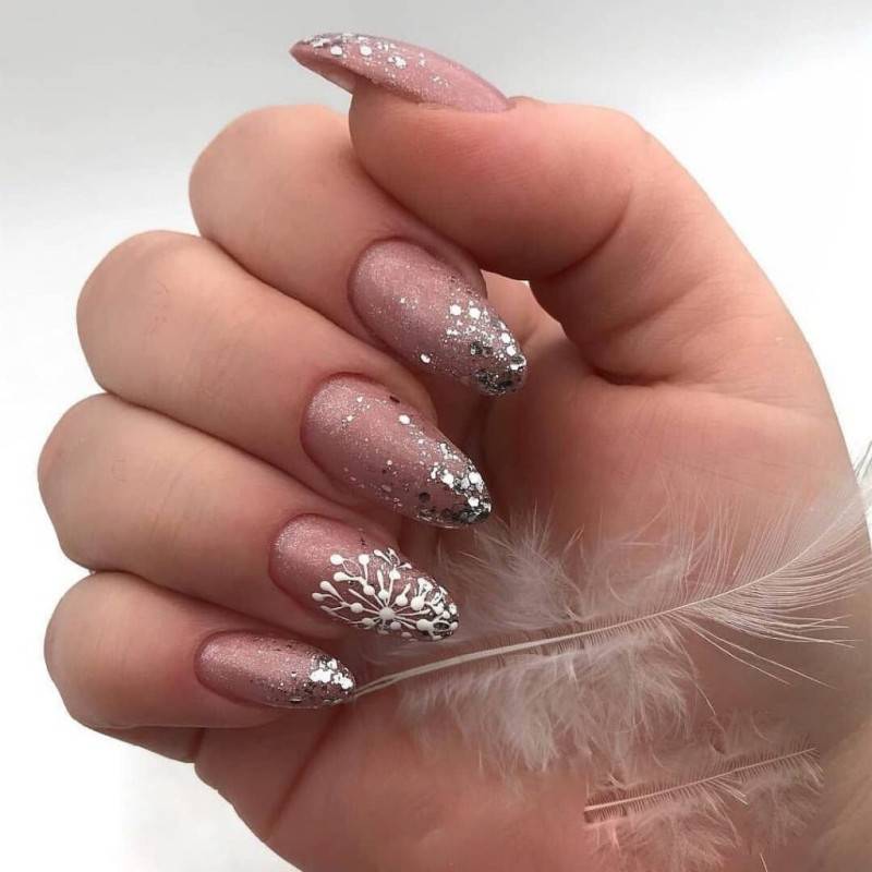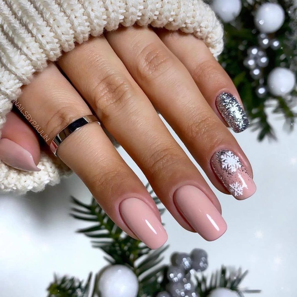 Также, очень эффектно будет смотреться сочетание серебра с нюдовыми матовыми ноготками или с парой белых ноготков. Плюс к этому дизайну, можно смело добавить рисунок снежинки белого или металлического цвета на один или два ногтя.