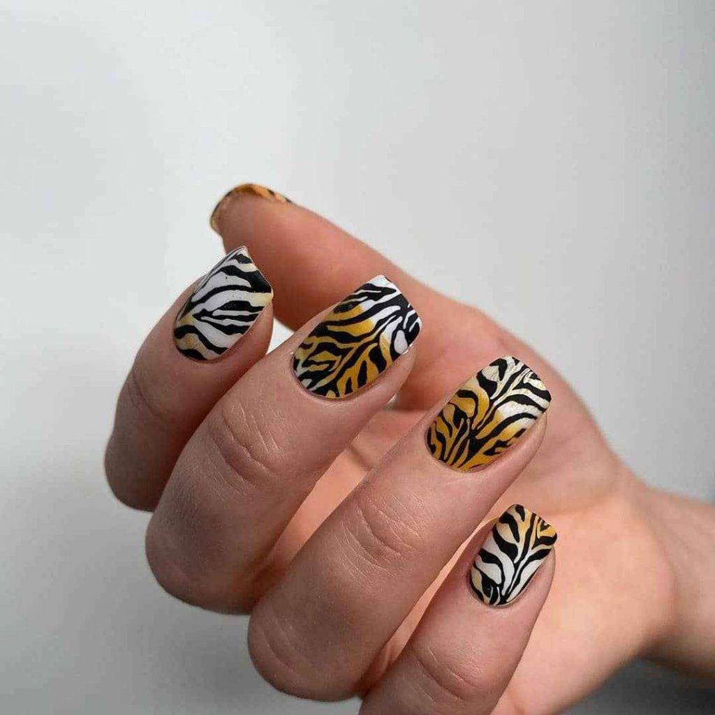 Среди актуальных идей — маникюр с тигровыми принтами, изображения мультяшных тигрят, куртка «хищник», изображения морды тигра, отпечатки лап хищника и силуэт в целом.