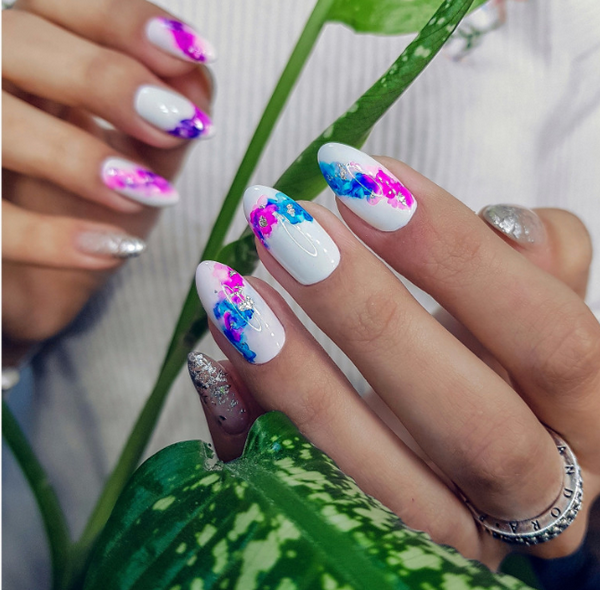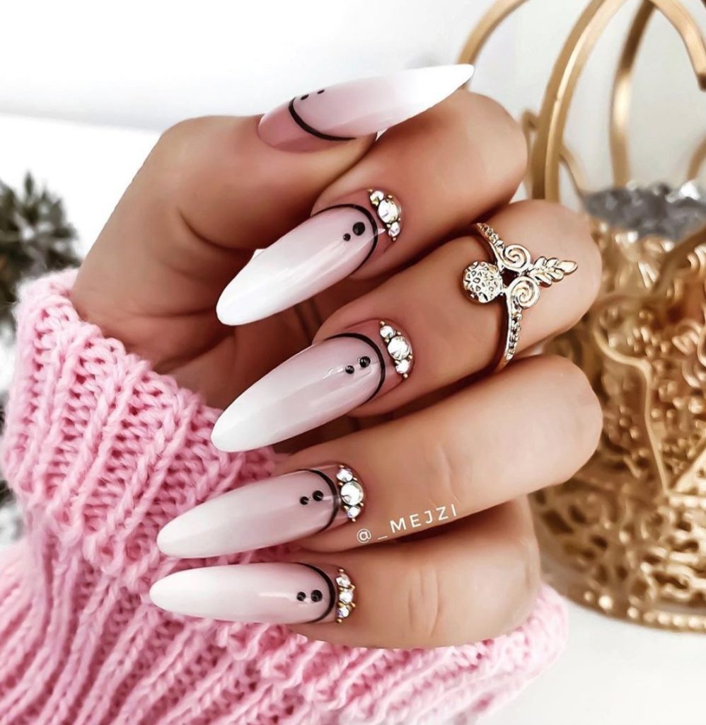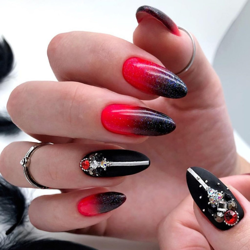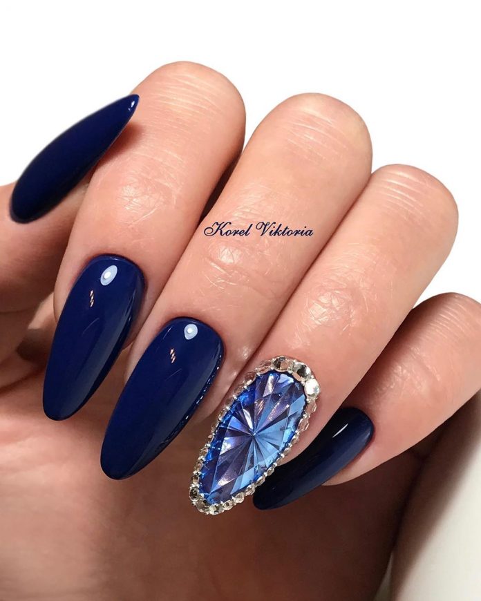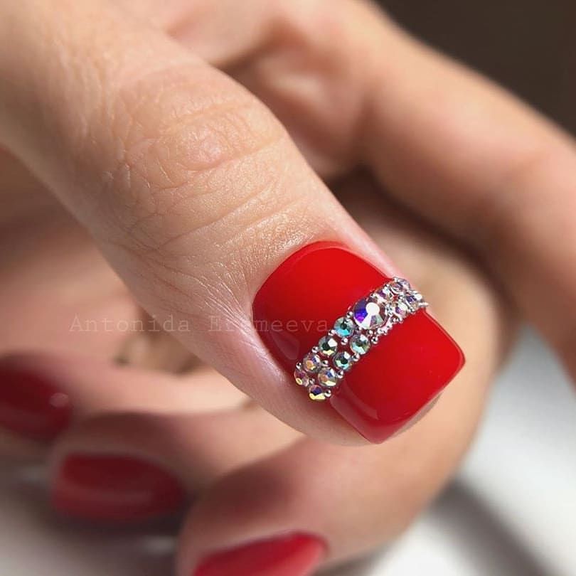 Дополнительно можно декорировать пару пальцев стразами или блёстками, а также сделать модные рисунки на акцентных ногтях.