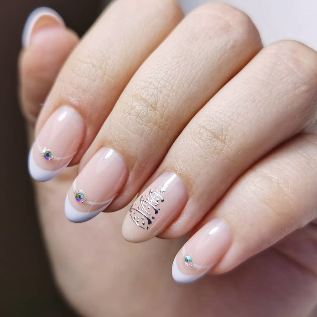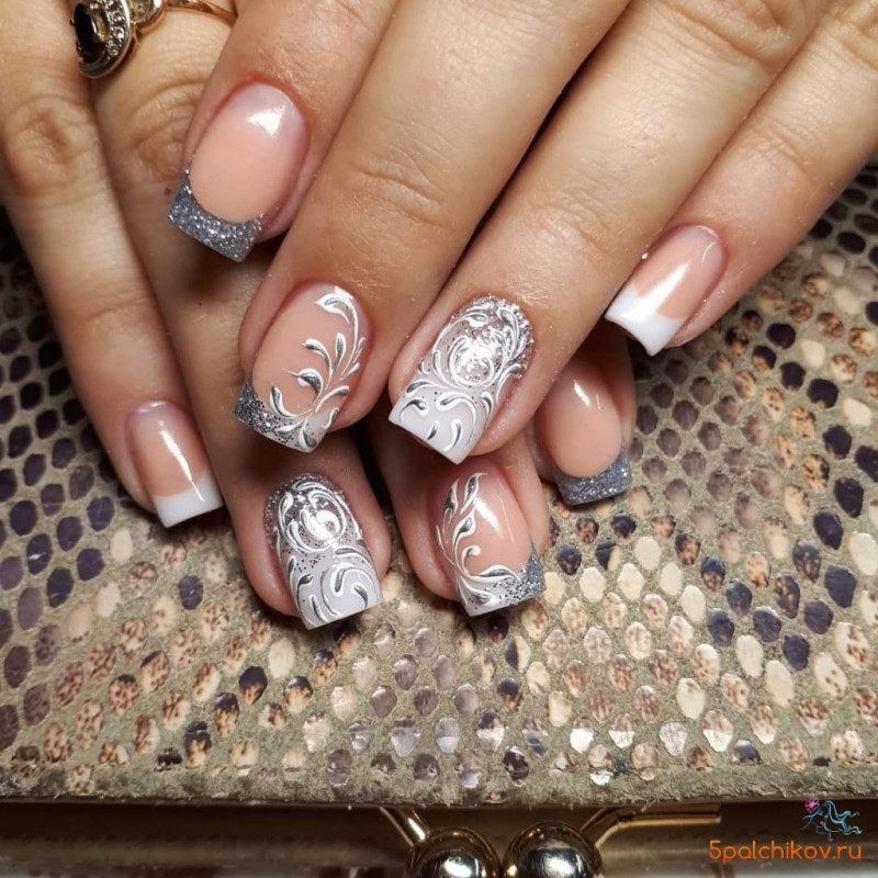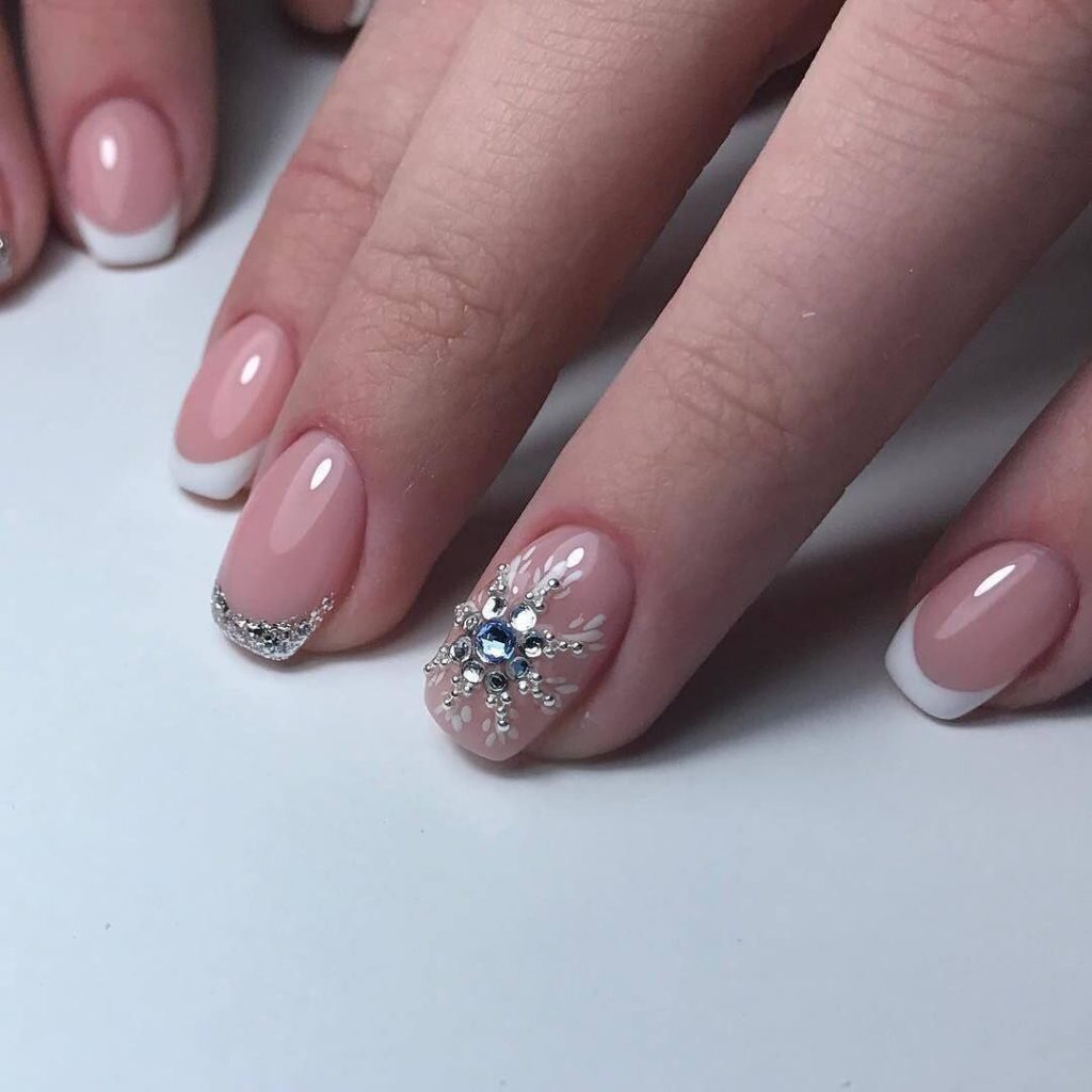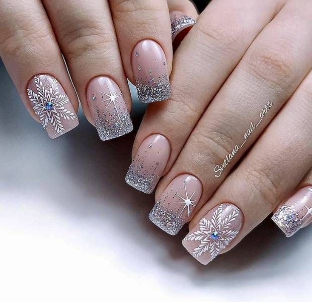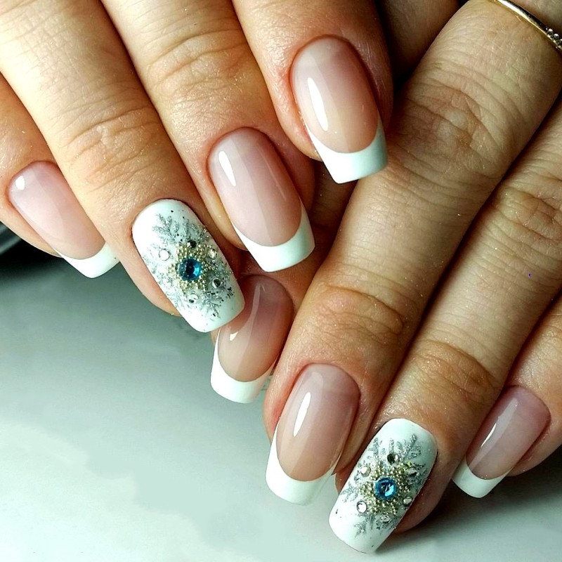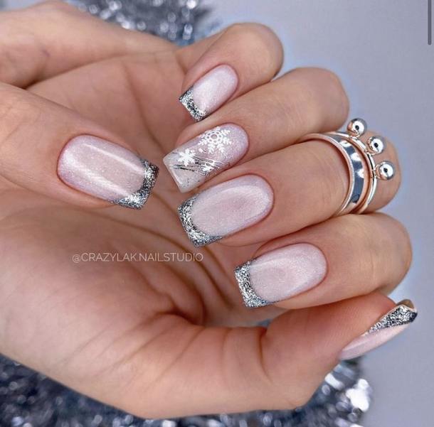 Стильно и празднично будет смотреться серебристый френч на прозрачных или полупрозрачных ноготках. Кроме того, к дизайну можно добавить стразы, рисунки снежинок или гель паутинку.