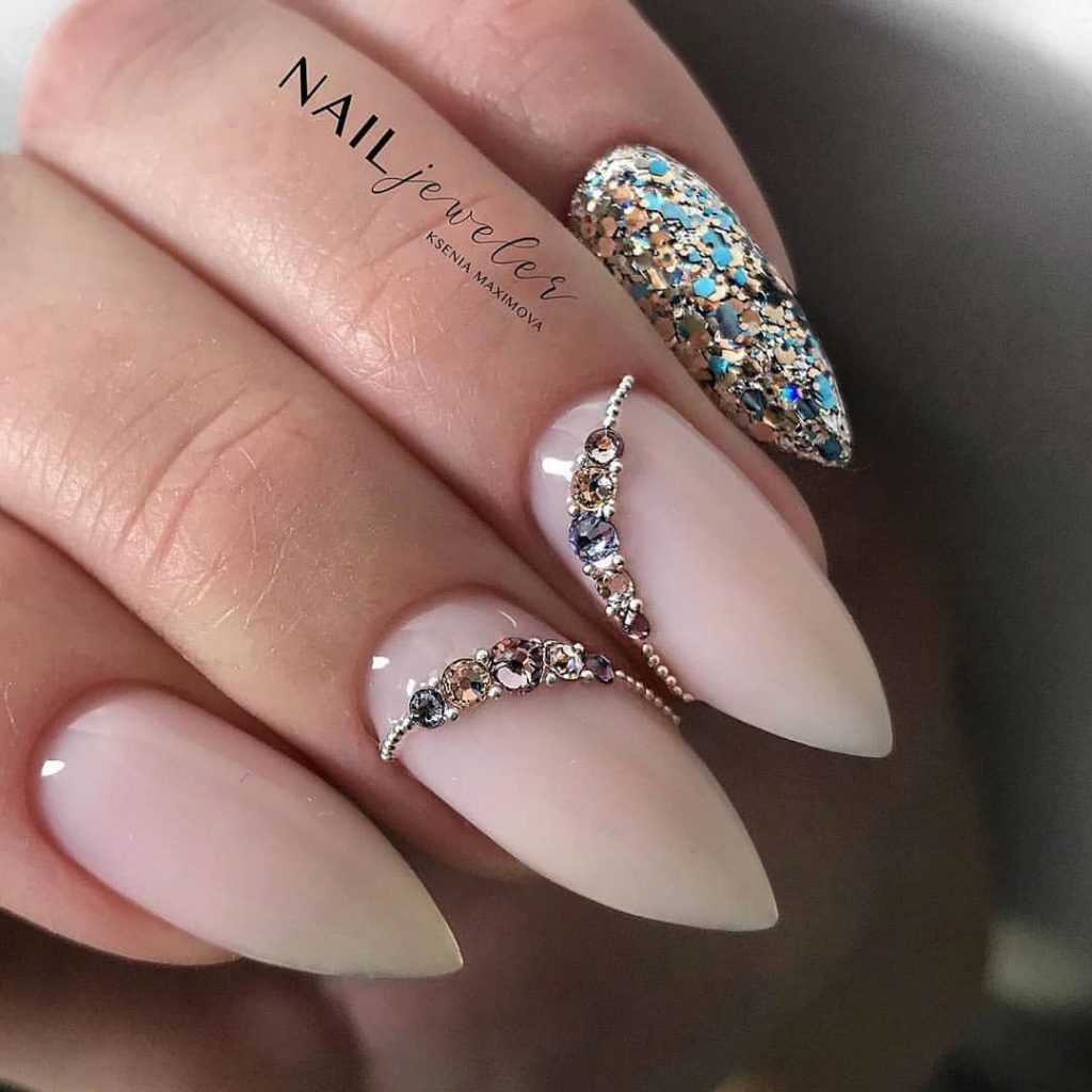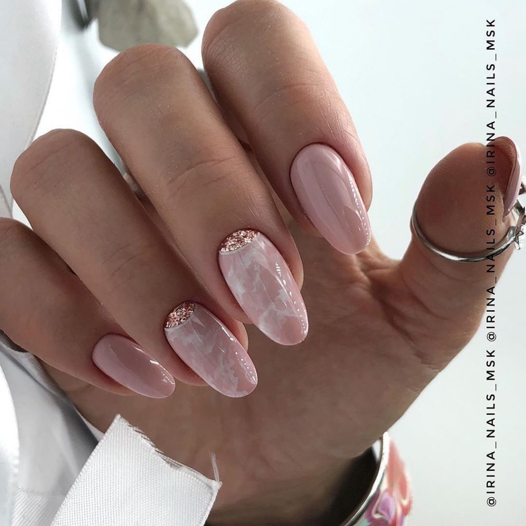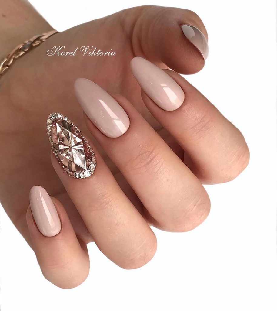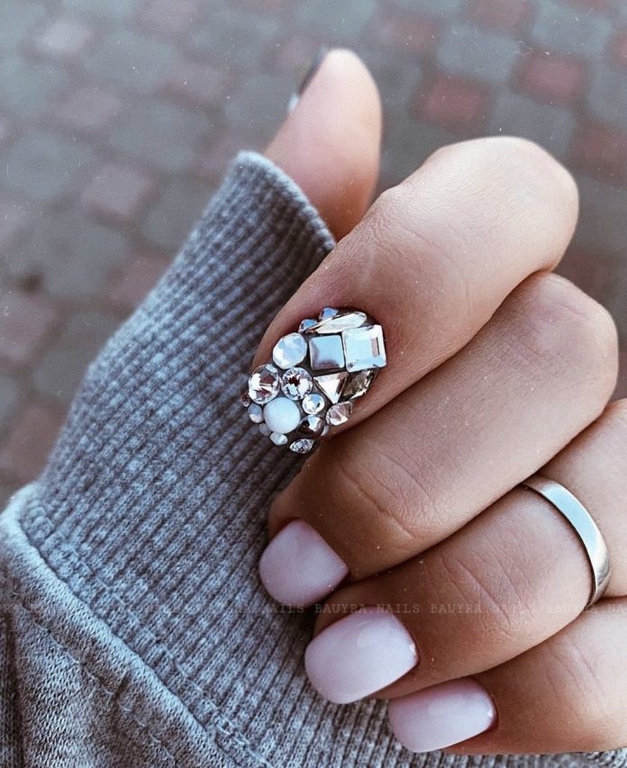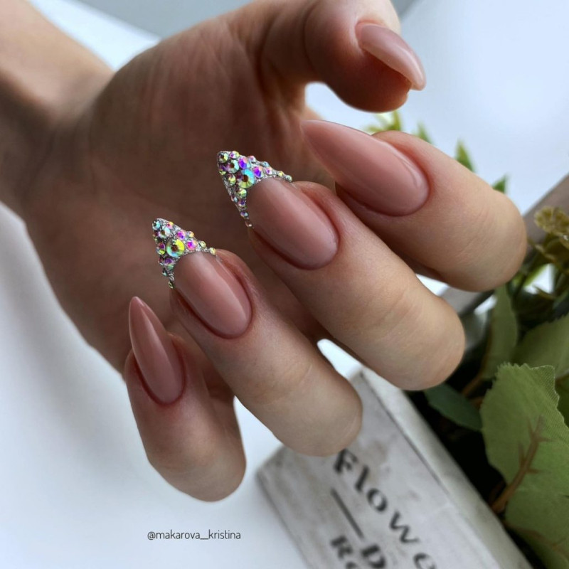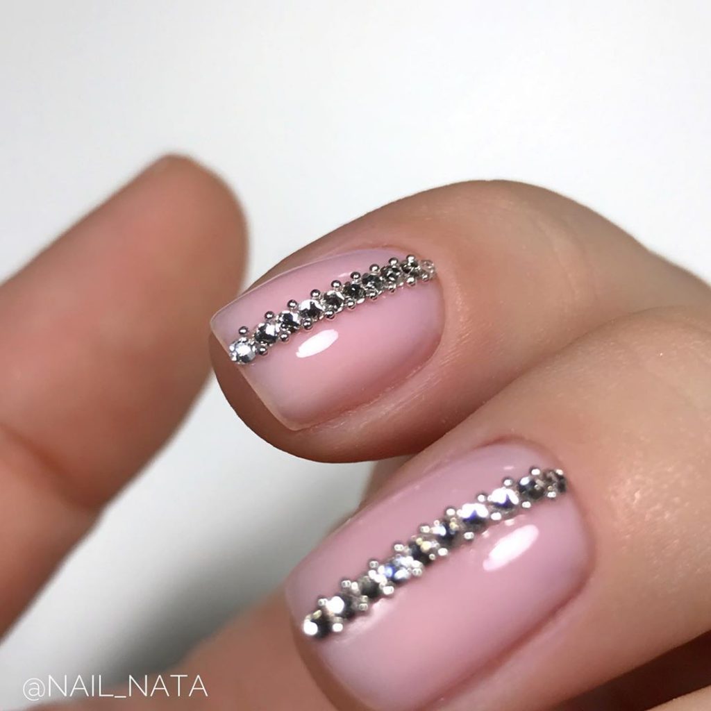 Обнаженные нюдовые цвета хорошо сочетаются с рисунками, стразами и различными дизайнами ногтей. Вы можете разнообразить такой маникюр с помощью золотой или серебряной ленты, наклеек в минималистском стиле, блесток, стильных камушек.
