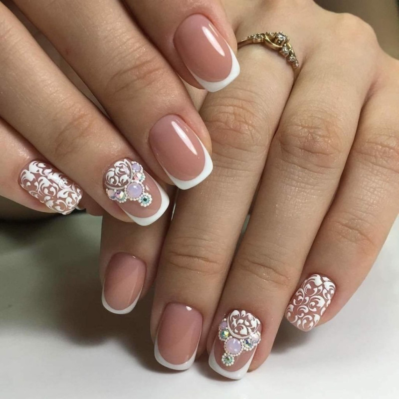 Его выбирают в зависимости от наряда, используемых цветов и оттенков. Беспроигрышные тона, которые подходят к любому образу – пудрово-розовый лак, кофе с молоком, капучино, корица, светло-голубой и классический белый.