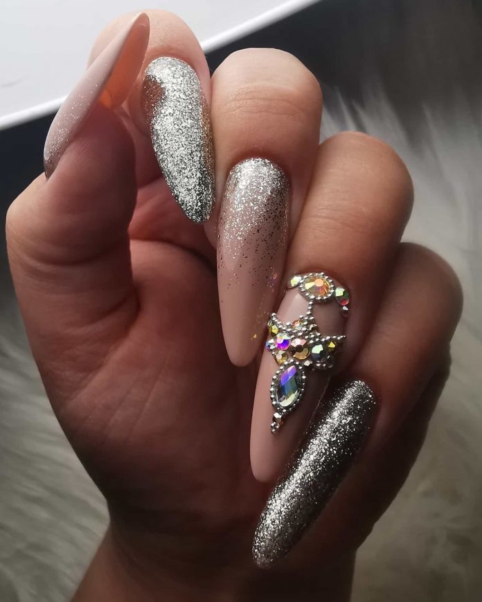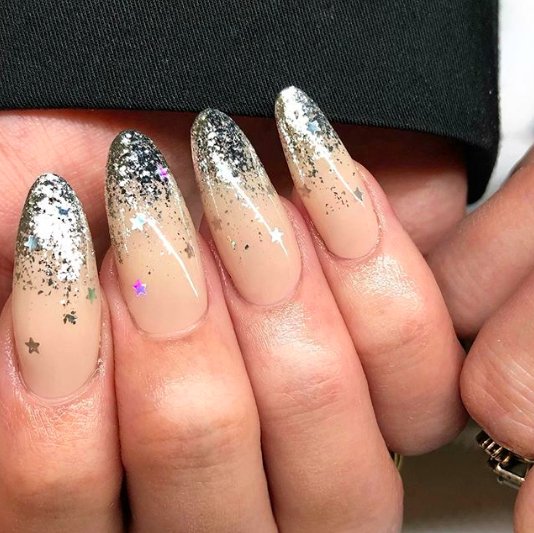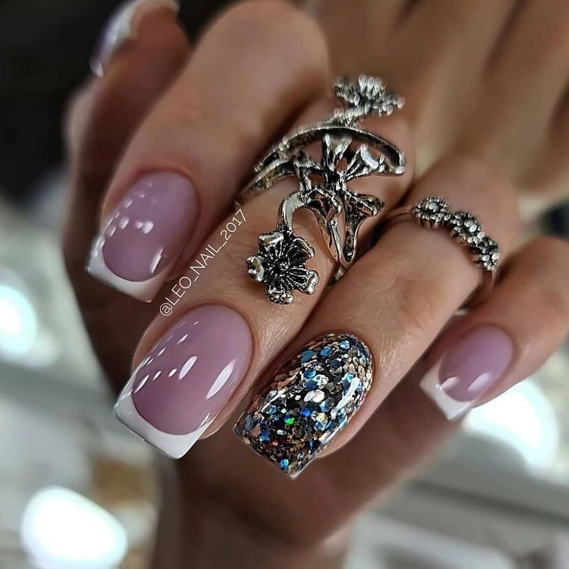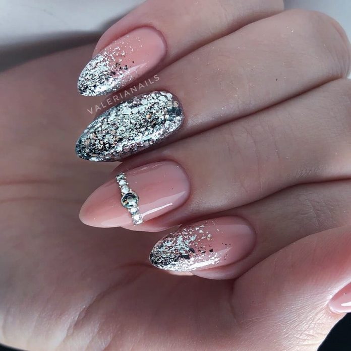 Если хочется чего-то более легкого, то можно полупрозрачные ноготки слегка присыпать серебряными блестками, а один ноготок сделать акцентным, и полностью выложить его такими же блестками. Будет и празднично и легко.
