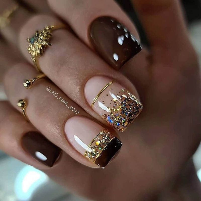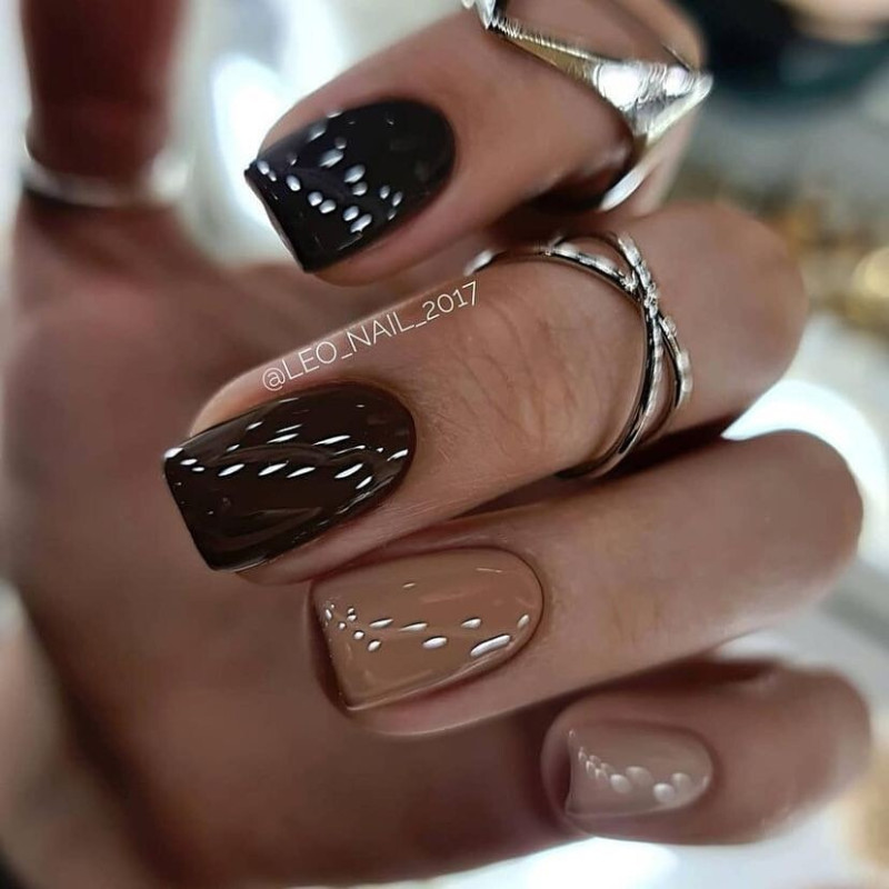 - Эффект латте. Маникюр выполнен в коричневых тонах, а на одном из ногтей создается белый градиент с переходом в коричневый оттенок, как на кофейном.