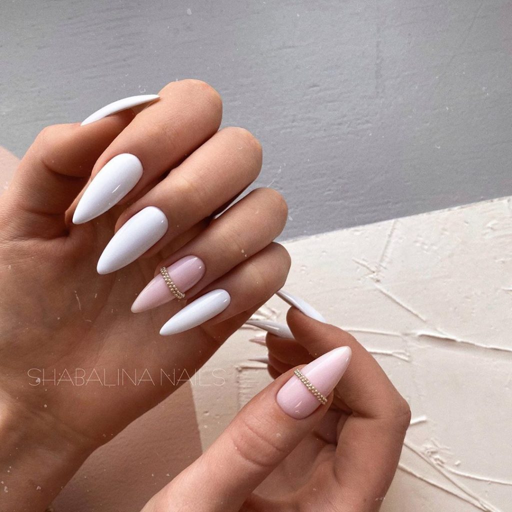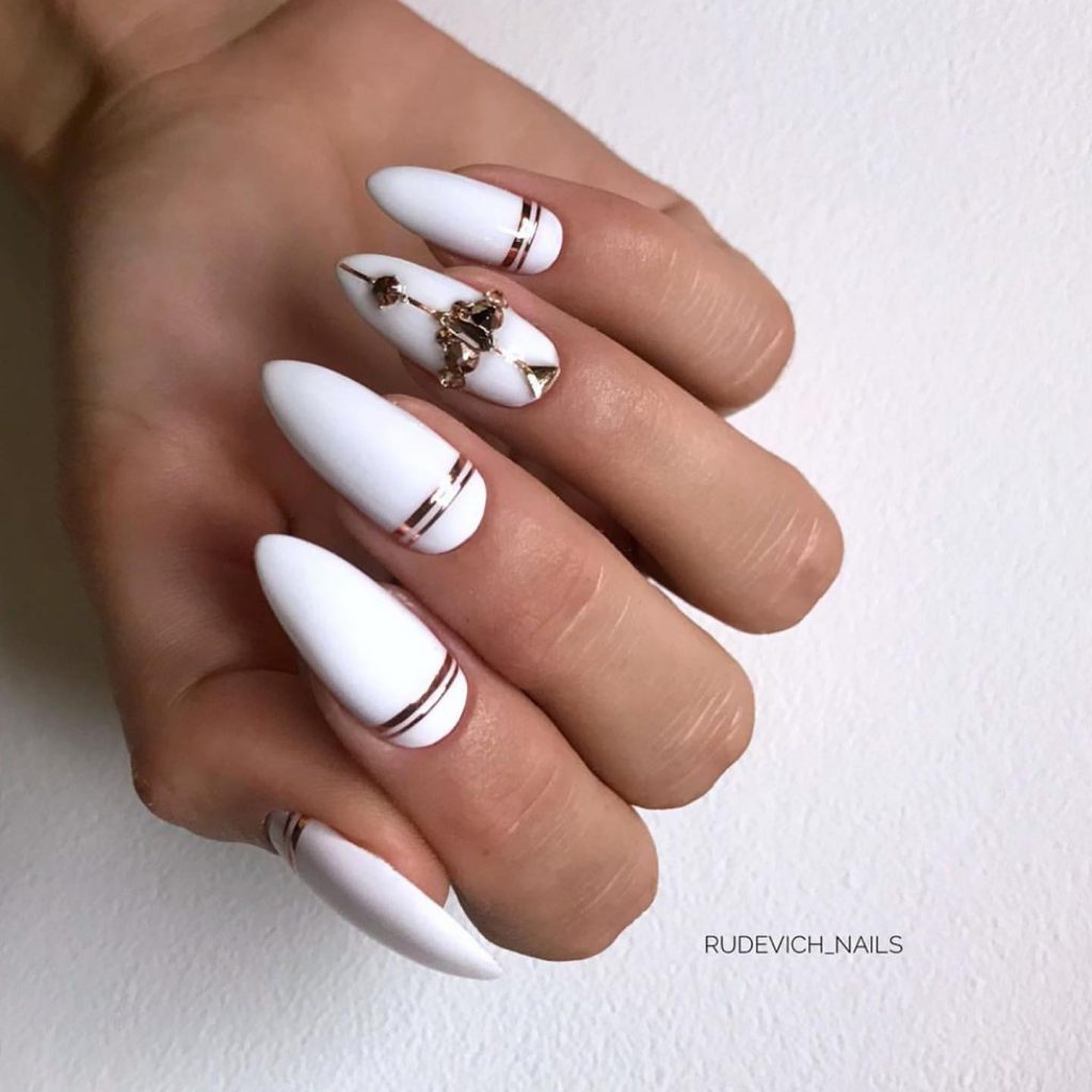 Для нежных образов рекомендуется использовать светлые тона – белый, шампанский, розовый, персиковый. Если платья черные или светлые, ногти подбираются по цветовой гамме, близкой к ним.