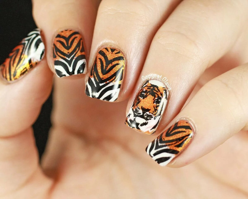 Красивый маникюр с тигром в новогоднюю ночь будет смотреться очень символично. Поэтому берем идеи дизайнеров на заметку и спешим удивить обладательницу года креативным подходом к новогоднему образу. Выполнение тигрового маникюра предполагает выполнение множества техник, от использования готовых наклеек, слайдеров, до аэрографии и художественной росписи.
