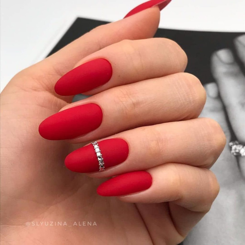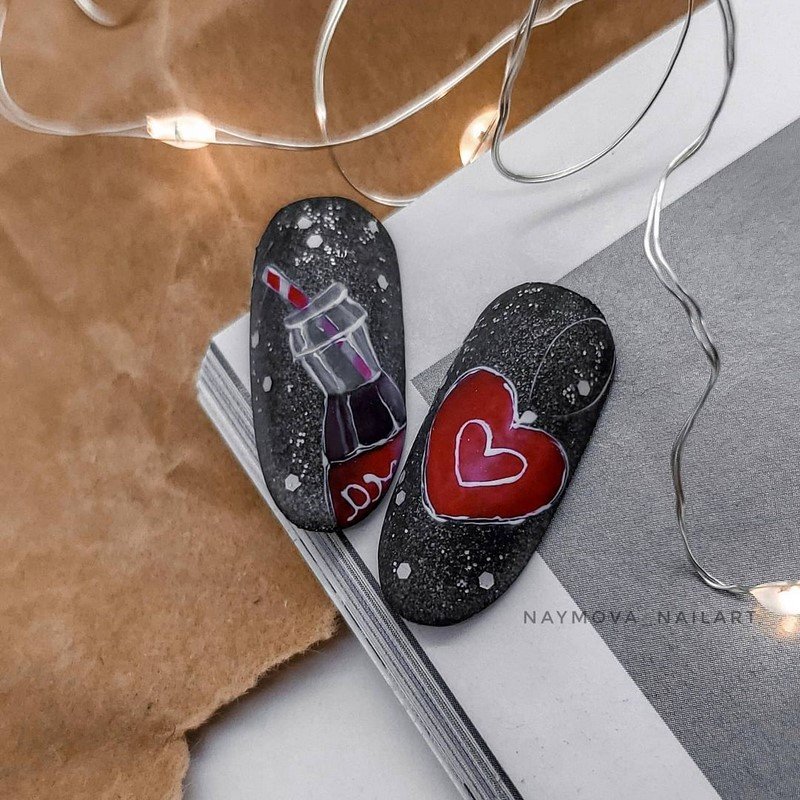 - Однотонный матовый маникюр с глянцевым сердечком на безымянном пальце. Это может быть бархатно-красный, синий, черный. Рисунок выполнен объемными акриловыми красками с глянцевым эффектом и напоминает крем на торте.