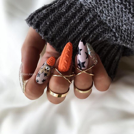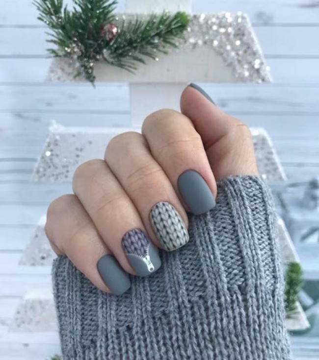 - Вязаный эффект подойдет тем, кто планирует встречать Новый год дома и в удобной одежде. На одном из ногтей сделан узор в виде вязаного свитера;