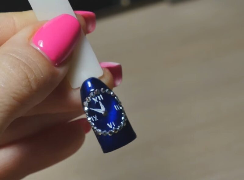 - Тонкой кистью с белым гель-лаком рисуем цифры и стрелки на «часах», сушим в лампе;
