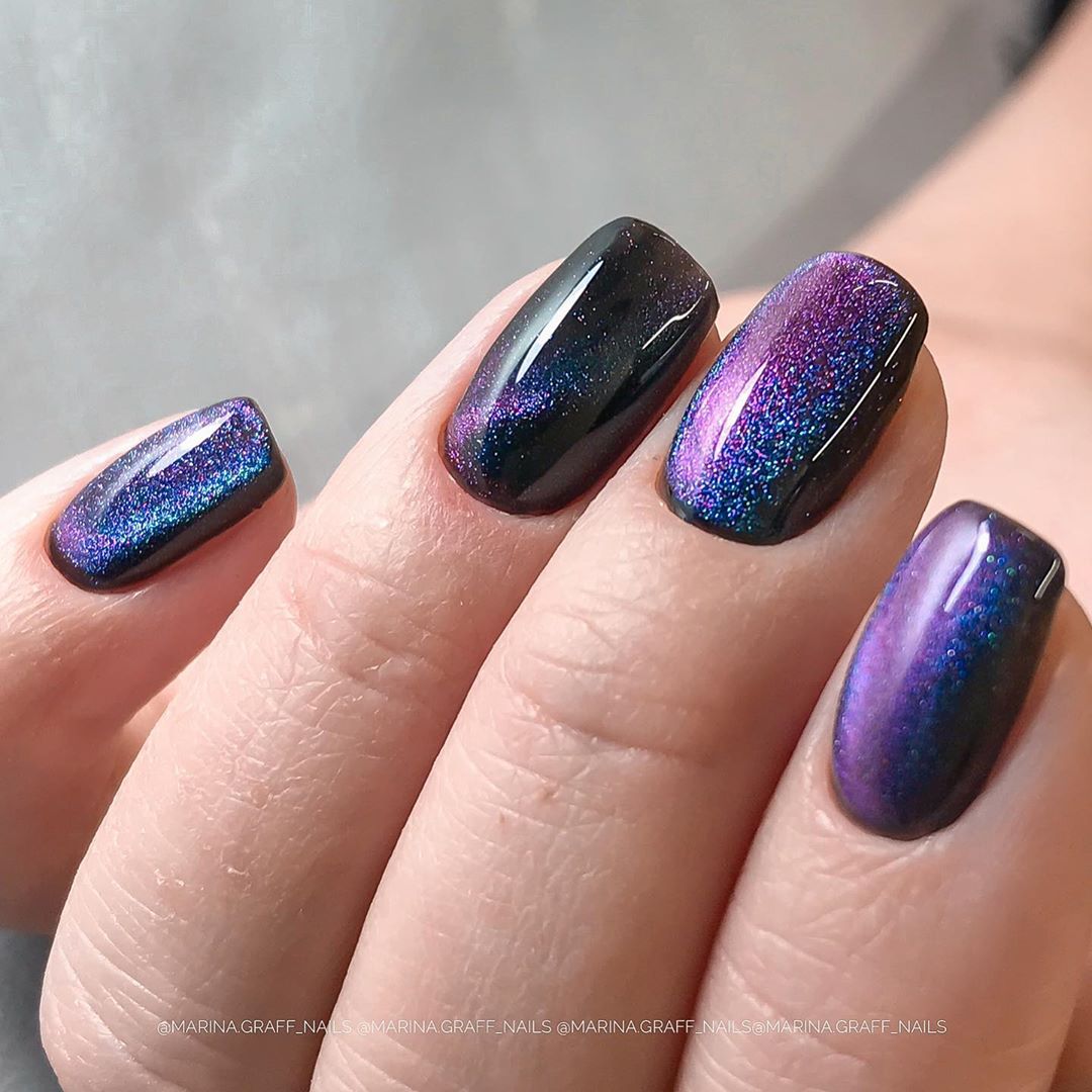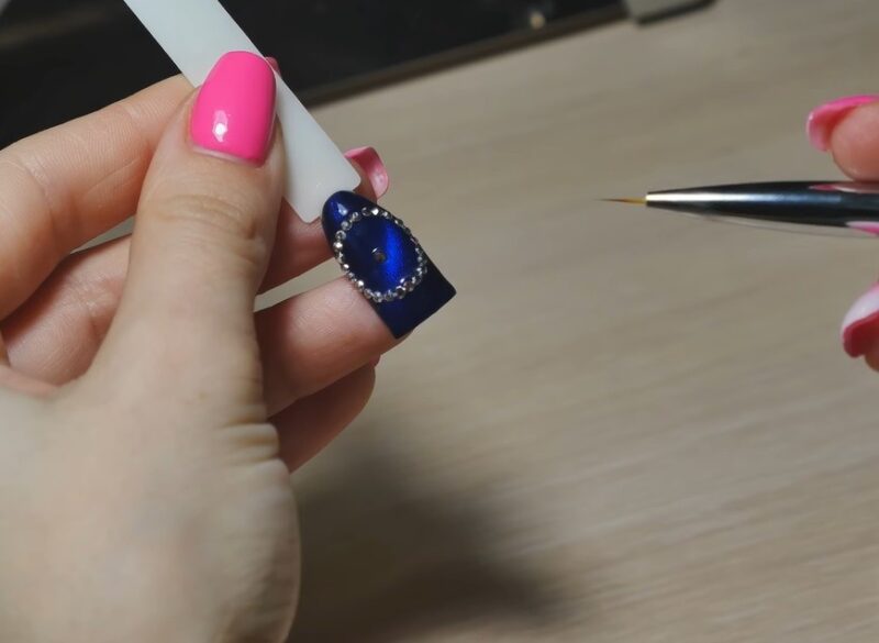 - Наносим на первый слой синий гель-лак «кошачий глаз», формируем «блик» магнитом и сушим в лампе;