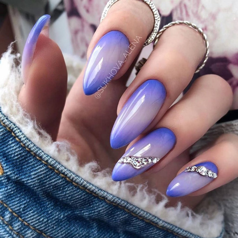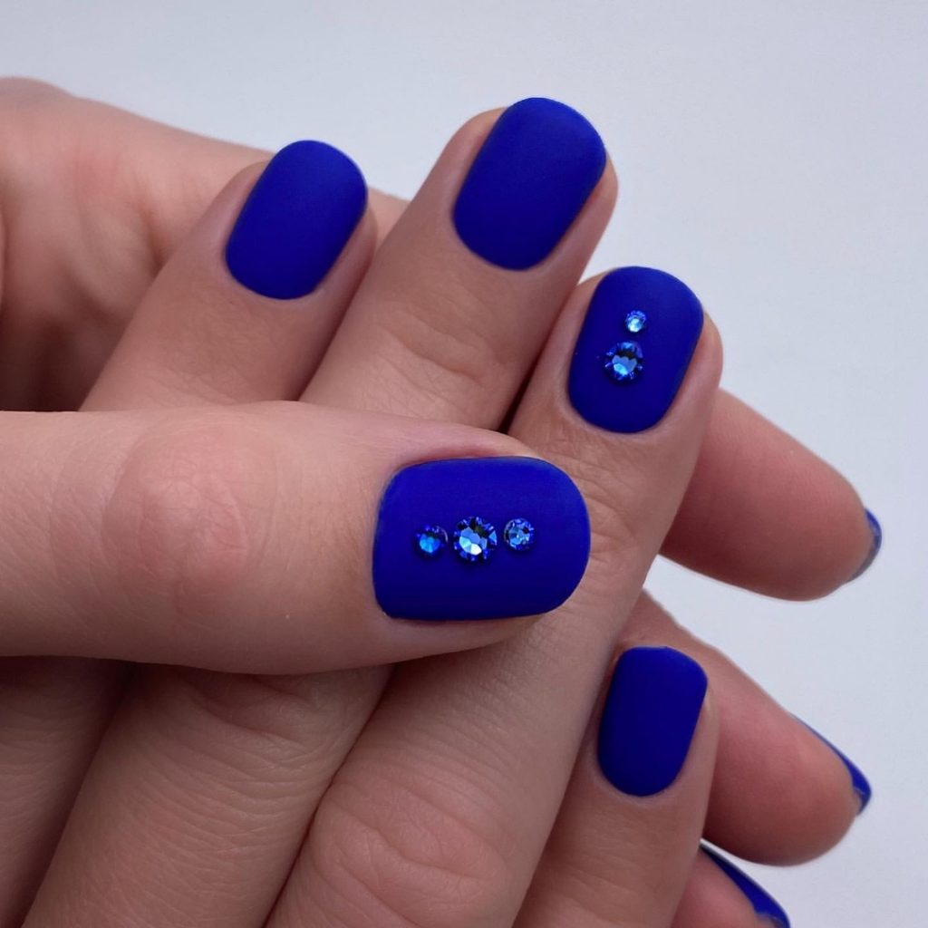 - Синий однотонный маникюр с тонким градиентом на всех ногтях. Выглядит освежающе и прекрасно сочетается с яркой одеждой.