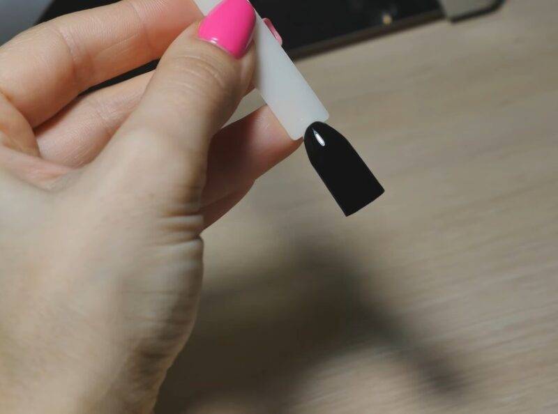 - Красим ногтевую пластину черным гель-лаком в один слой, сушим в лампе;