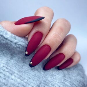 Яркий маникюр 2023 года способен добавлять женственность в праздничный образ и привлекать внимание окружающих. Стойкий лак красного либо интенсивного бордового оттенка выигрышно смотрится в сочетании с белым рисунком