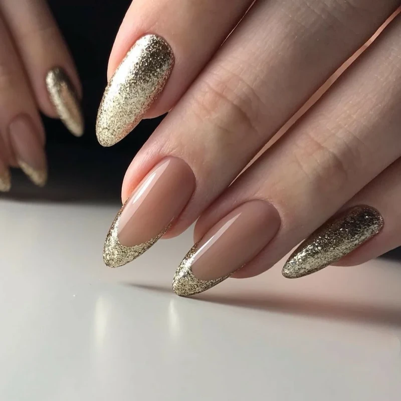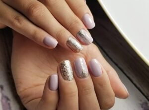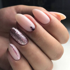 Нежно-розовый лак на коротких ногтях подарит ощущение легкости и свободы. Оригинальности и сияния добавит золотой глиттер в нижней части ногтевой пластины.