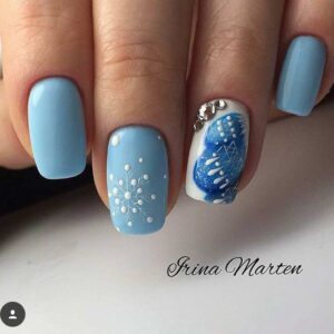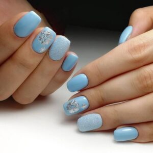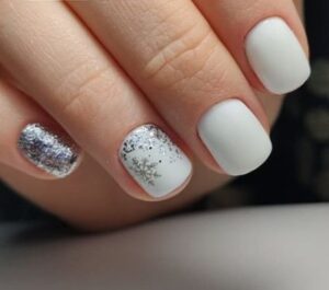 Для обладательниц коротких ногтей беспроигрышным вариантом станет белый маникюр в сочетании с серебром. Покройте все ногти серебристым лаком, а два накрасьте белым. Также на них можно нанести рисунок в виде снежинки и пару страз.
