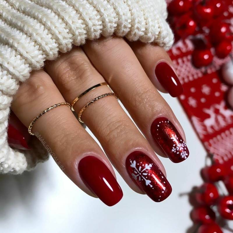 Классический красный вариант маникюра отлично гармонирует со всеми тонами одежды. Любители повеселиться могут выбрать маникюр на Новый 2023 год, который дополняется снеговиками, оленями, снежинками, изображениями Санты и иными персонажами