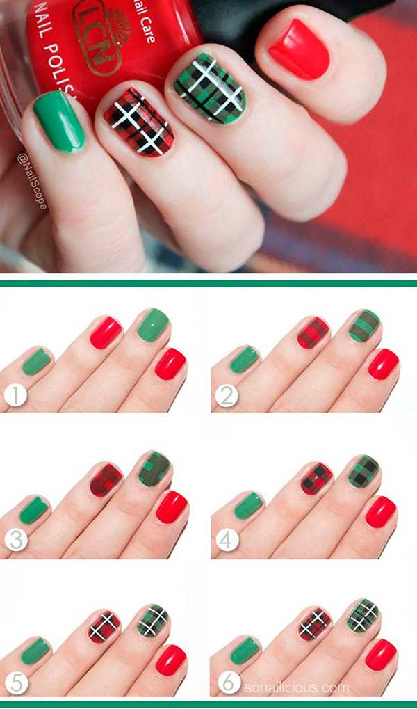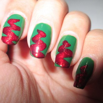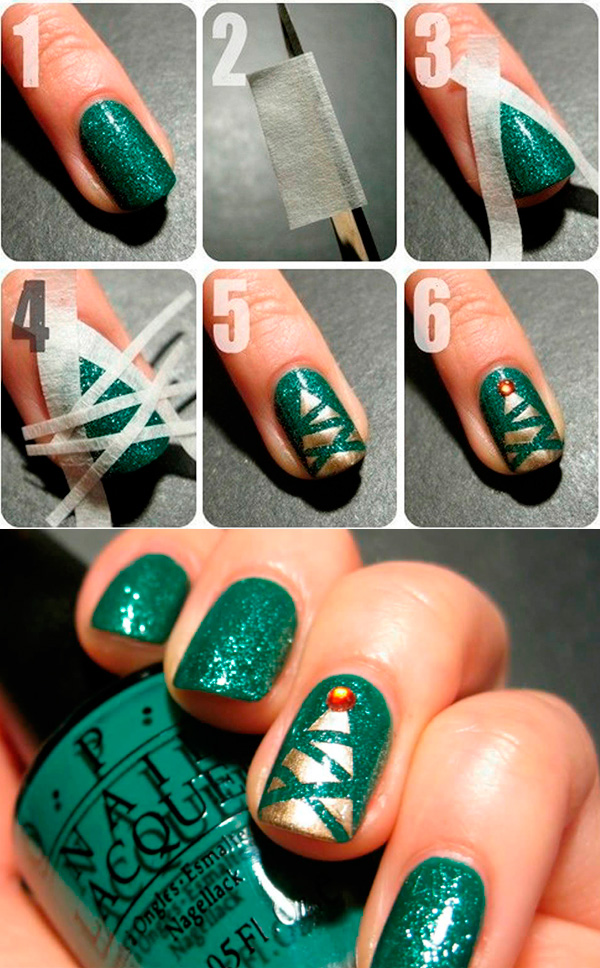 С помощью скотч-ленты можно сделать отличный новогодний дизайн. На ноготках при этом будут присутствовать изображения лакричных палочек. Такой маникюр лучше выполнять в красно-белой цветовой гамме.