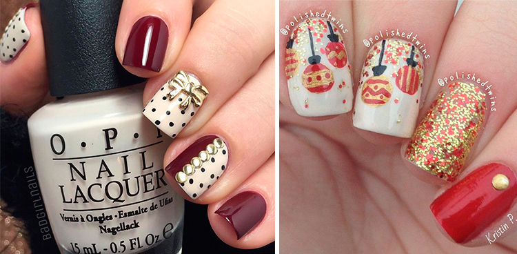 Такой праздничный нейл-арт не сможет остаться незамеченным. Сочетание белого и бордового цвета дополнит любой образ, а красный бант и узоры представят интересные рисунки.