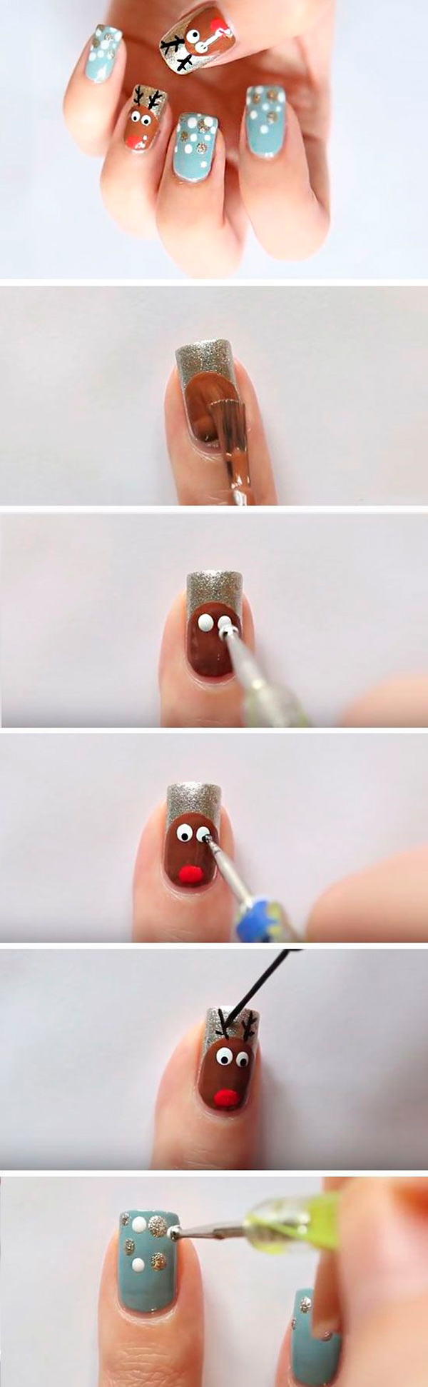 Для создания милого и эстетичного маникюра можно использовать тематические рисунки и нежные оттенки. Вязаный узор, напоминающий текстуру свитера, а также золотистый глиттер и оленья мордочка подарят атмосферу сказки.