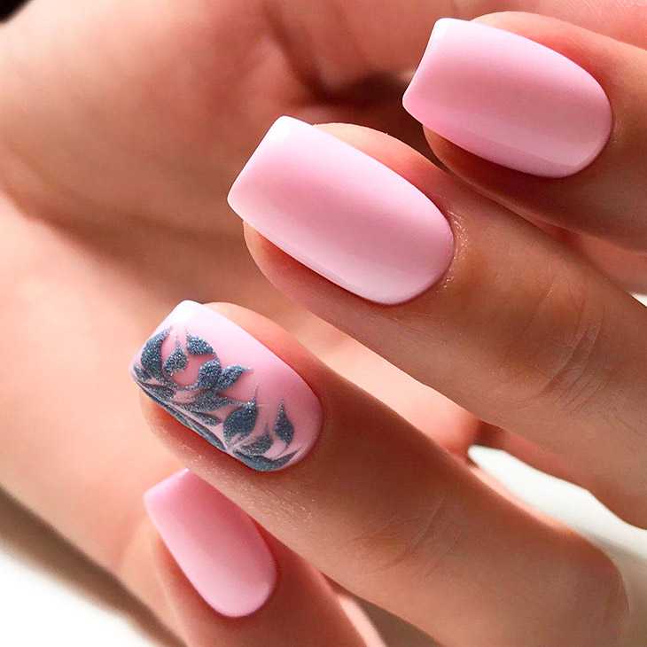 Розовый очень удачно гармонирует с оттенками серого: можно взять этот цвет за основу акцентных ноготков или сделать отдельные штрихи.
