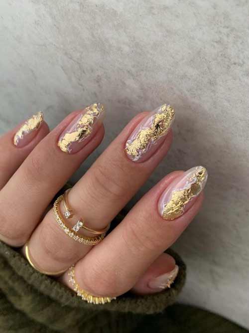 Декором с фольгой можно дополнять любой дизайн. Она прекрасно смотрится в сочетании с актуальными новогодними дизайнами 2022. Используется зеркальная, термофольга, матовая, кружевная, жидкая и трафаретная фольга, придающая ногтям блеск и переливы на свету. Использование фольги – один из самых простых дизайнов, достаточно только фантазии мастера, чтобы создать неповторимое украшение для ногтей.