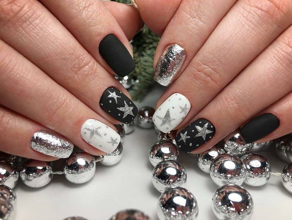 Стильный маникюр для новогоднего праздника предложен с дизайном звездочками, что выполняются с помощью жидкого глиттера. Интересным будет декор звездочками на одном ноготке в модном новогоднем маникюре, а также использование черного, серого, белого гель-лаков и глиттера, которыми можно покрыть пальчики по очереди, украсив их блестящими звездочками.