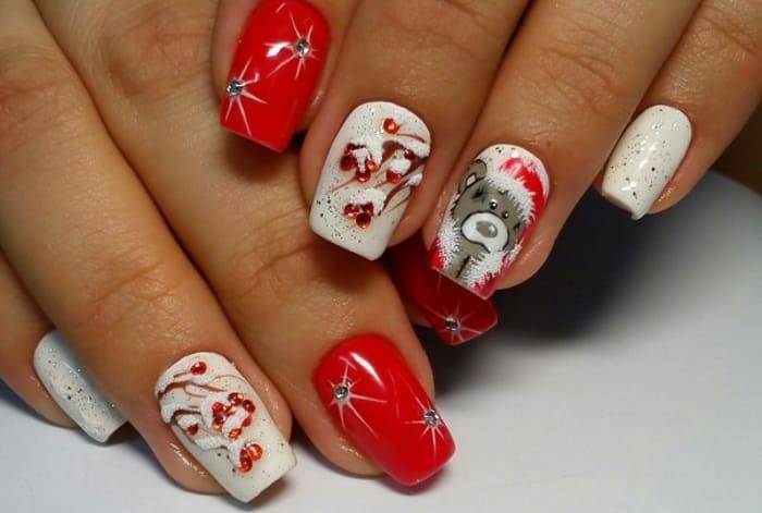 А также можно комбинировать новогодние рисунки с фольгой, блестками и стразами, подбирая нужные цвета.