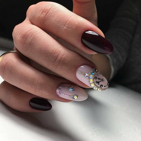 Бой курантов и ожидание нового года ассоциируется с часами, что может послужить необыкновенной идеей для дизайна новогоднего маникюра 2022, а именно, изобразить циферблат на одном из ноготков, использовав краски и небольшие камушки, что будет символично и так мило.