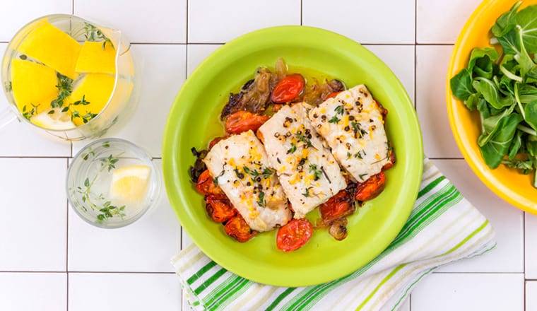 - Запеченная рыба на овощной поджарке