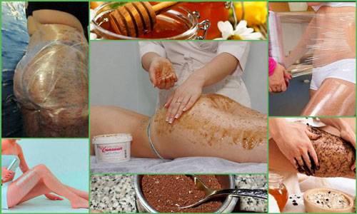 Медовые смеси могут быть аллергенными, поэтому подходят не всем. Перед тем, как намазаться, очистите кожу жестким скрабом. Для большего эффекта можно смешать кофейную гущу с морской солью. Возьмите их в равных долях и слегка разведите водой.