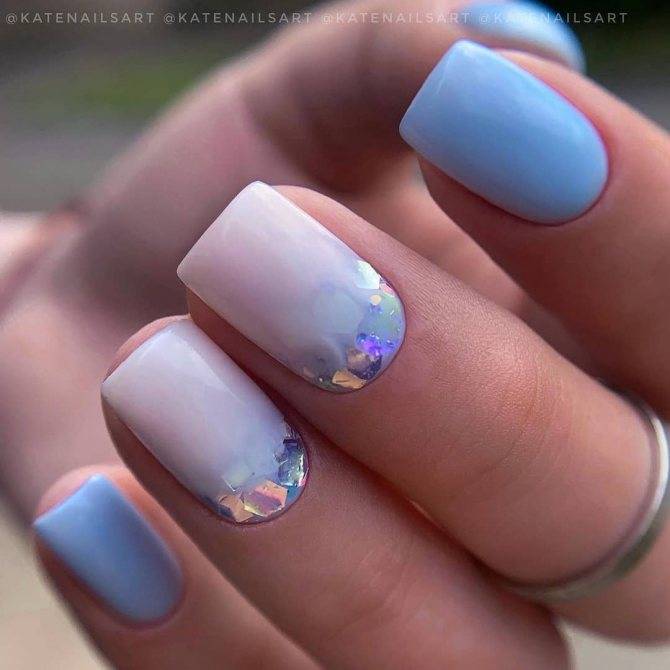 В списке актуальных техник френч, лунный маникюр, оформление в стиле «negative space» и однотонный маникюр, которые чудесно сочетаются с замысловатыми узорами, снежинками, фольгой, стразами, «стеклянным» дизайном, выполненным фрагментами «битого стекла» и прочими идеями.