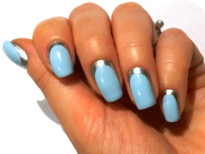 После появления на свет различного декоративного материала, в том числе фольги, обратный френч гель лаком стали выполнять при помощи зеркальных фрагментов в дизайне.