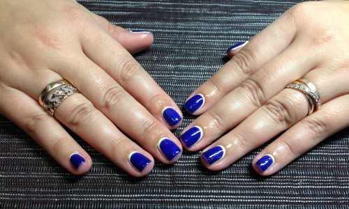Перед созданием любого дизайна нужно сделать маникюр, после чего обезжирить ногти. Нанести базу для гель-лака. Высушить в УФ-лампе. Покрыть ногти тем цветом гель-лака, который будет просвечиваться возле кутикулы. Гармоничнее всего смотрятся золотистый, серебристый, светло-розовый, белый. Высушить под лампой. Нанести второй слой и также высушить. Немного отступив от кутикулы и боковых валиков, прокрасить следующий слой – ярко-синим, черным, красным или другим контрастным оттенком