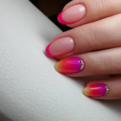 Такой маникюр хорош для летнего декора ногтей и позволяет использовать сразу несколько цветов без создания градиентных улыбок. Подобный обратный френч гель-лаком выглядит объёмно.
